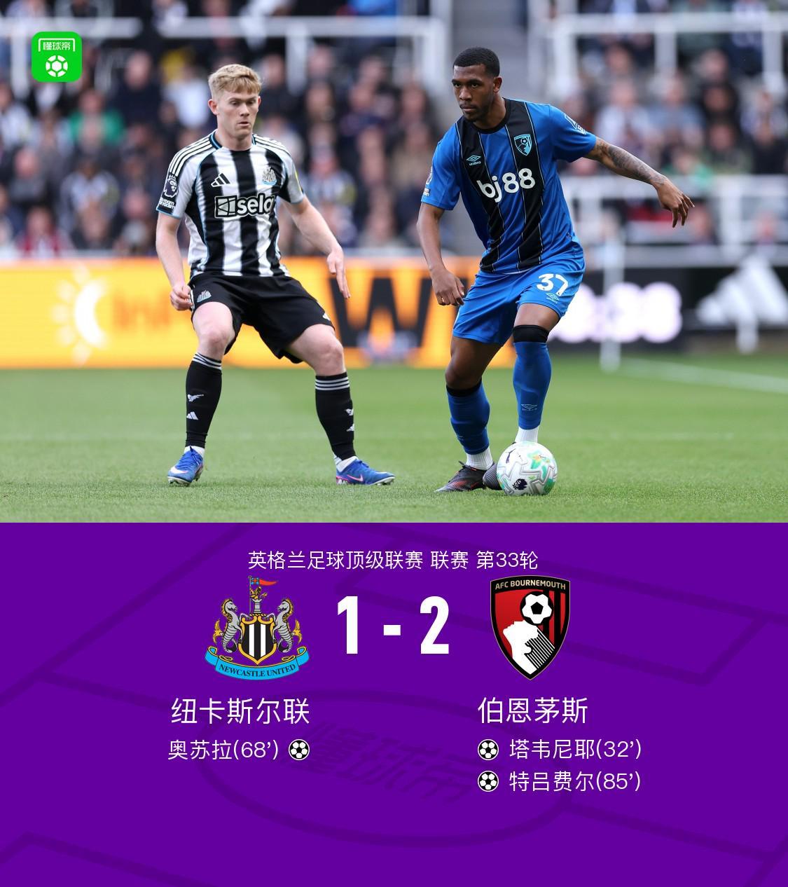 在4月18日进行的英格兰足球顶级联赛第33轮的一场焦点对决中,纽卡斯尔联坐镇主场迎战伯恩茅斯。本场比赛过程跌宕起伏,最终纽卡斯尔联以1 - 2的比分惜败给伯恩茅斯。其中,纽卡斯尔联的奥苏拉取得进球,而伯恩茅斯方面,塔韦尼耶和特吕费尔分别建功。