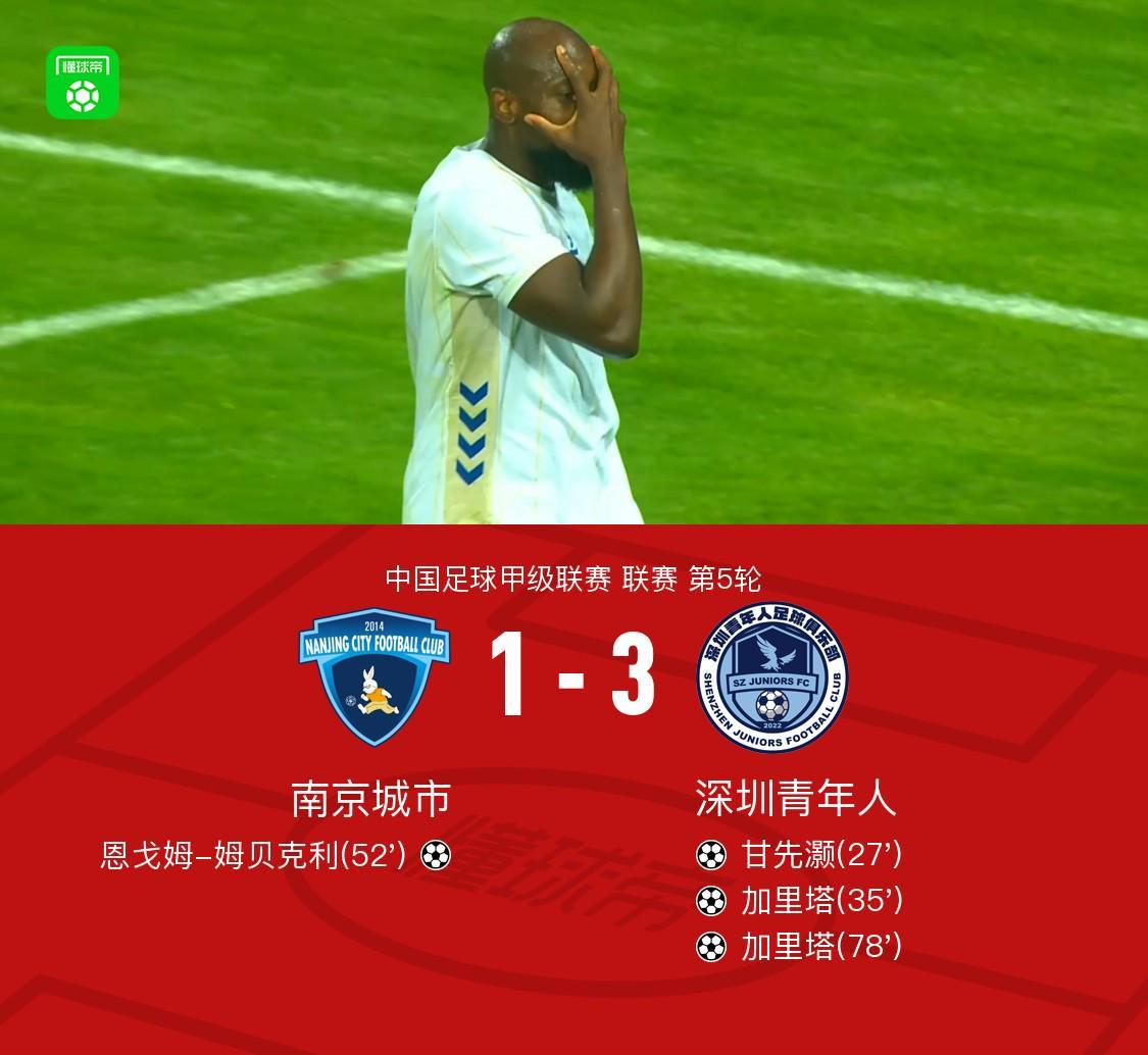 第78分钟,南京城市后防送出大礼,加里塔低射梅开二度,南京城市1-3深圳青年人,比赛基本失去悬念。