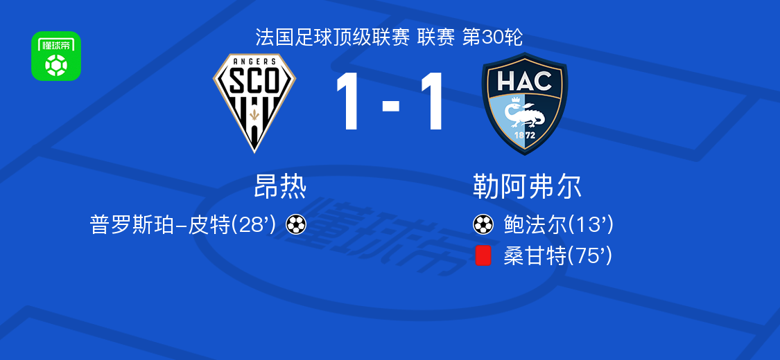 法甲第30轮:昂热1-1勒阿弗尔,鲍法尔首开纪录,普罗斯珀-皮特扳平