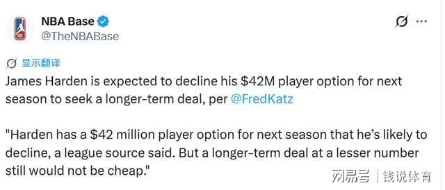 北京时间4月17日,徽声在线从权威体育媒体The Athletic(TA)处获悉,联盟内部消息人士透露,哈登在下赛季握有一份价值高达4200万美元的球员选项。从当前的形势分析,他极有可能选择跳出这份合同。即便哈登后续签订的新合同年薪有所下滑,但鉴于他在赛场上的巨大影响力,这份长期合同的总薪资依然会处于联盟顶尖水平,数额相当可观。