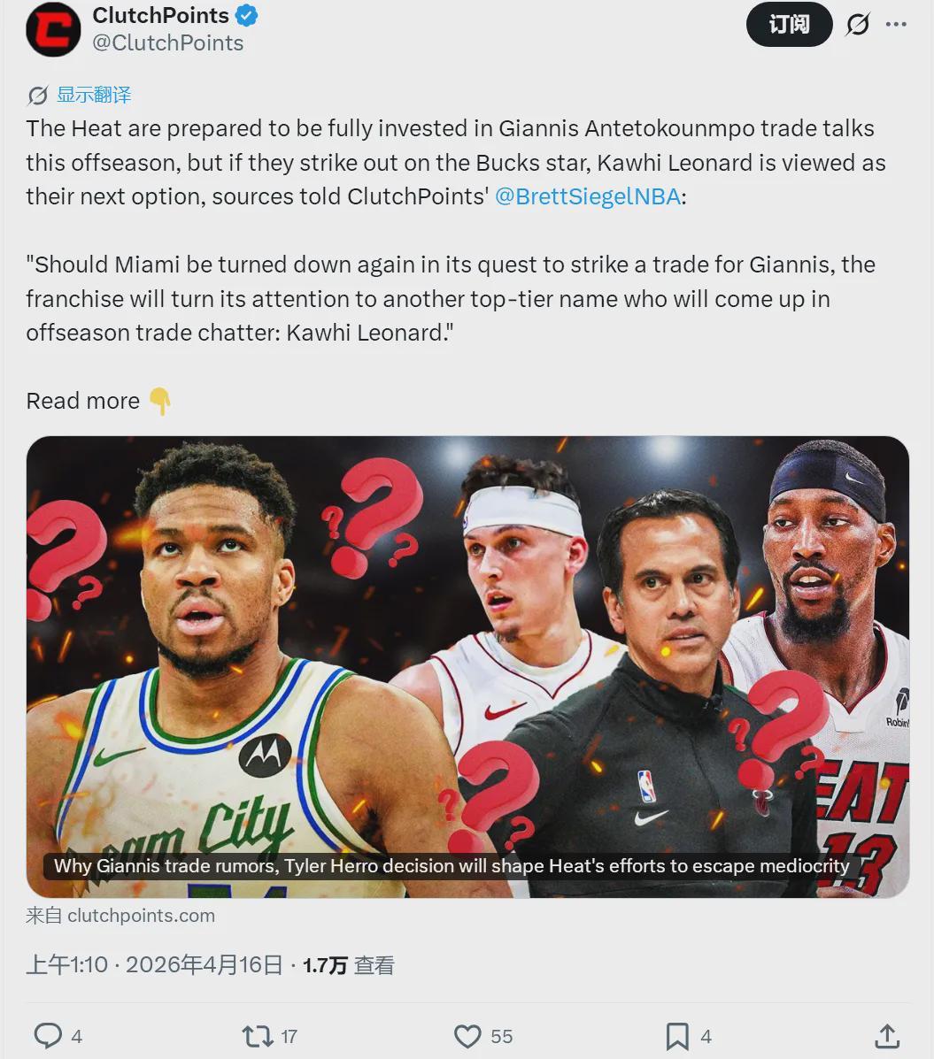 若追逐字母哥的计划落空,热火将迅速转向快船队的伦纳德作为备选目标。本赛季,热火以43胜39负的战绩排名东部第10,并在附加赛中不敌黄蜂,无缘季后赛。这一结果也终结了球队连续6个赛季晋级季后赛的纪录。面对如此困境,热火管理层深知,若不进行大规模调整,球队将难以重返竞争行列。