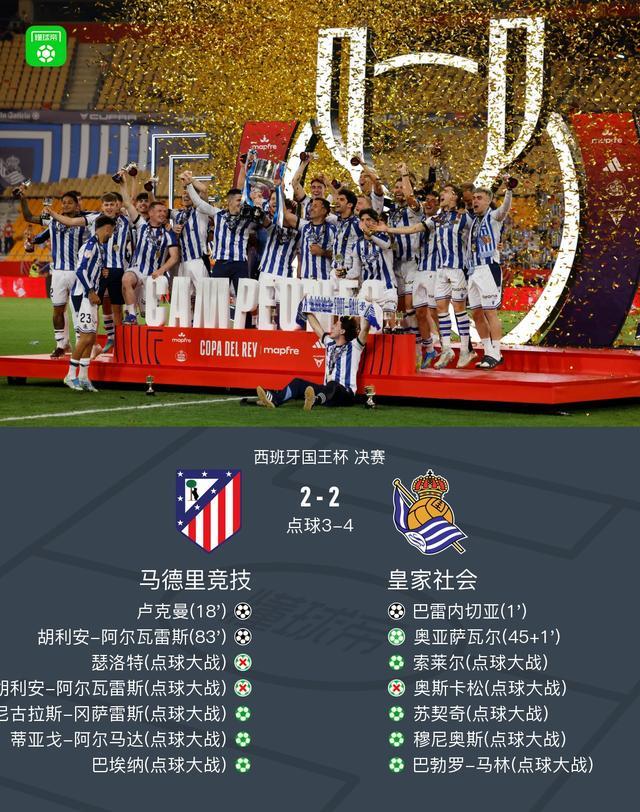 第120分钟,点球大战尘埃落定,小蜘蛛、瑟洛特失点,皇家社会总比分6-5点胜马竞,夺得冠军
