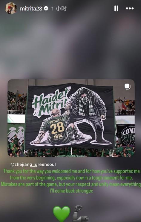 米特里策深情致谢浙江球迷:你们的支持是我回归的最大动力