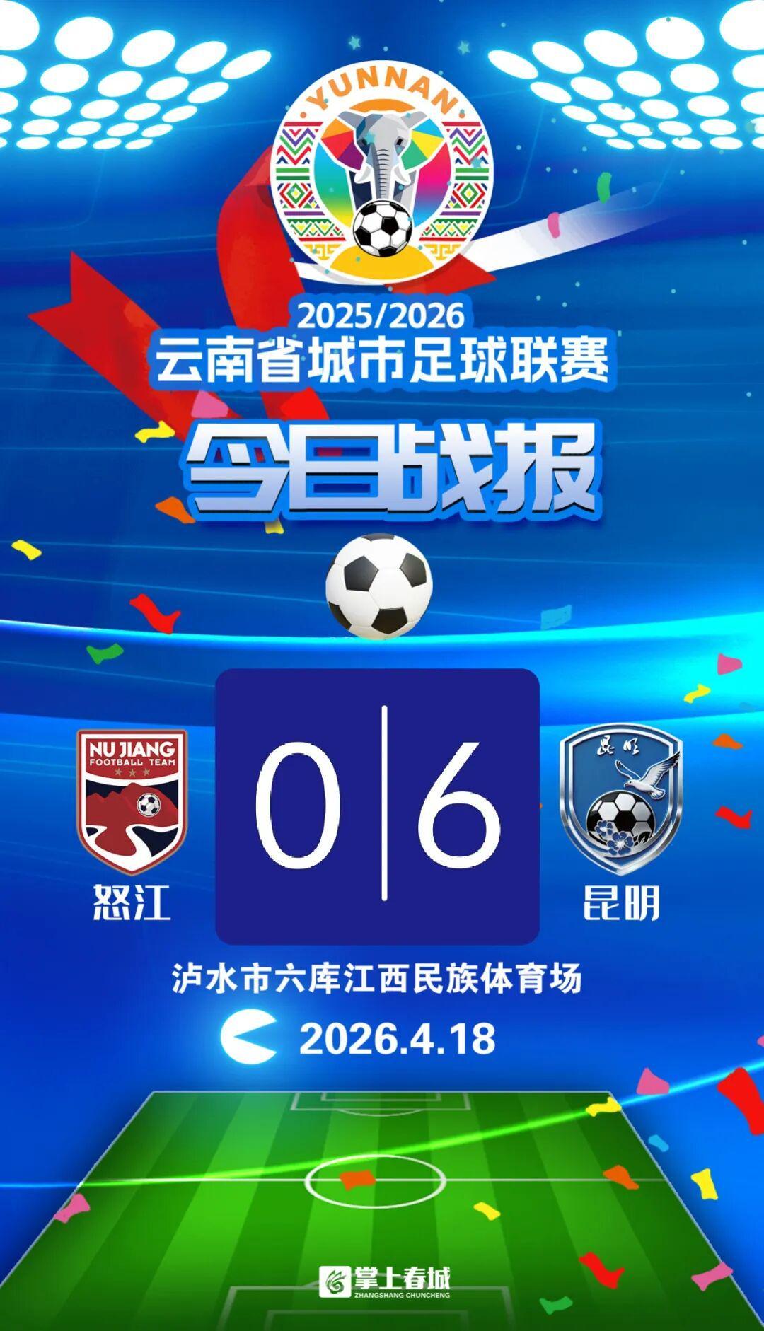 4月18日晚19时35分,2025/2026赛季富滇银行云南省城市足球联赛(滇超联赛)第十轮焦点战在泸水市六库江西民族体育场展开激烈角逐,昆明队客场挑战怒江队。继上轮1球惜败丽江队后,昆明队此役展现出强劲反弹势头,11号马翊伦独中三元上演帽子戏法,18号邓迪梅开二度,17号蔡青恒锦上添花,最终以6比0的悬殊比分取得一场酣畅淋漓的大胜。