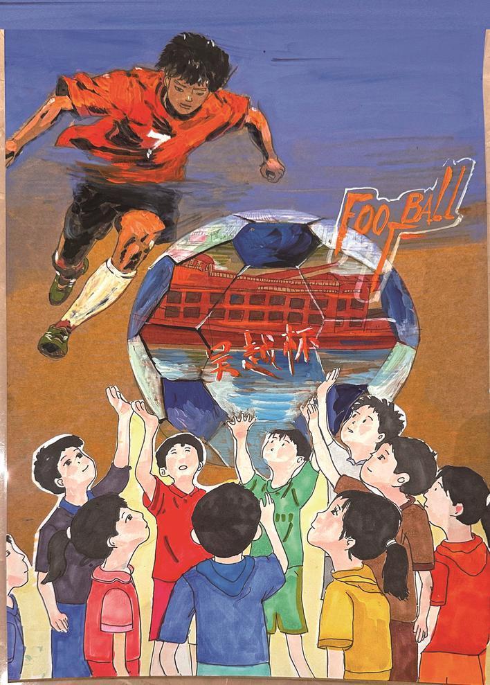 近日,一场别开生面的足球赛事——吴越杯,在赛场上掀起了阵阵热潮。上海尚阳外国语学校桐乡实验学校405班的张家赫同学,以一幅名为《吴越杯超燃赛场》的作品,生动记录了这一激动人心的时刻。该作品在指导老师沈震亚的悉心指导下完成,展现了观众与球迷们共同托举写有“吴越杯”字样足球的壮观场景,深刻表达了大家对这场比赛的殷切期待。