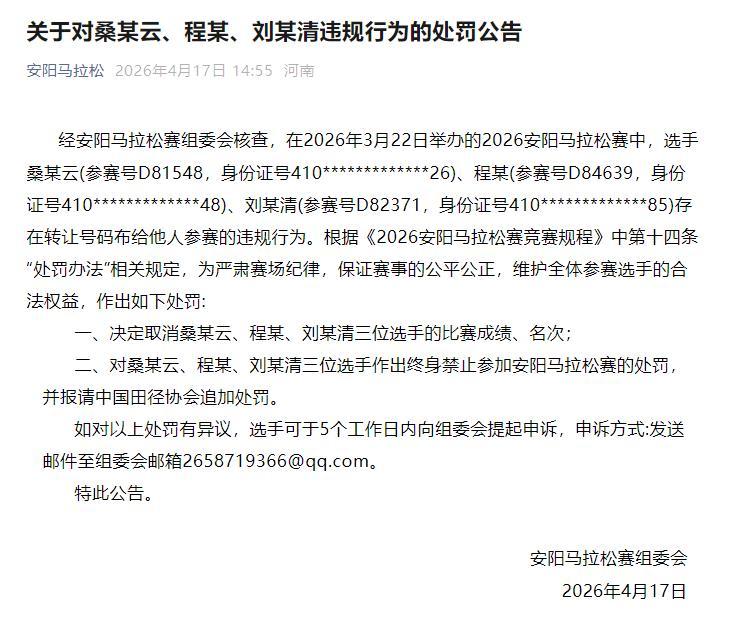 徽声在线消息,4月17日,河南安阳马拉松赛事组委会正式对外发布了一则重要处罚公告。经过组委会的详细核查,发现在2026年3月22日盛大举行的2026安阳马拉松赛中,存在选手违规转让号码布的情况。具体涉及到的选手有桑某云(参赛号D81548,身份证号410*************26)、程某(参赛号D84639,身份证号410*************48)以及刘某清(参赛号D82371,身份证号410*************85)。这三位选手均存在将号码布转让给他人参赛的严重违规行为。