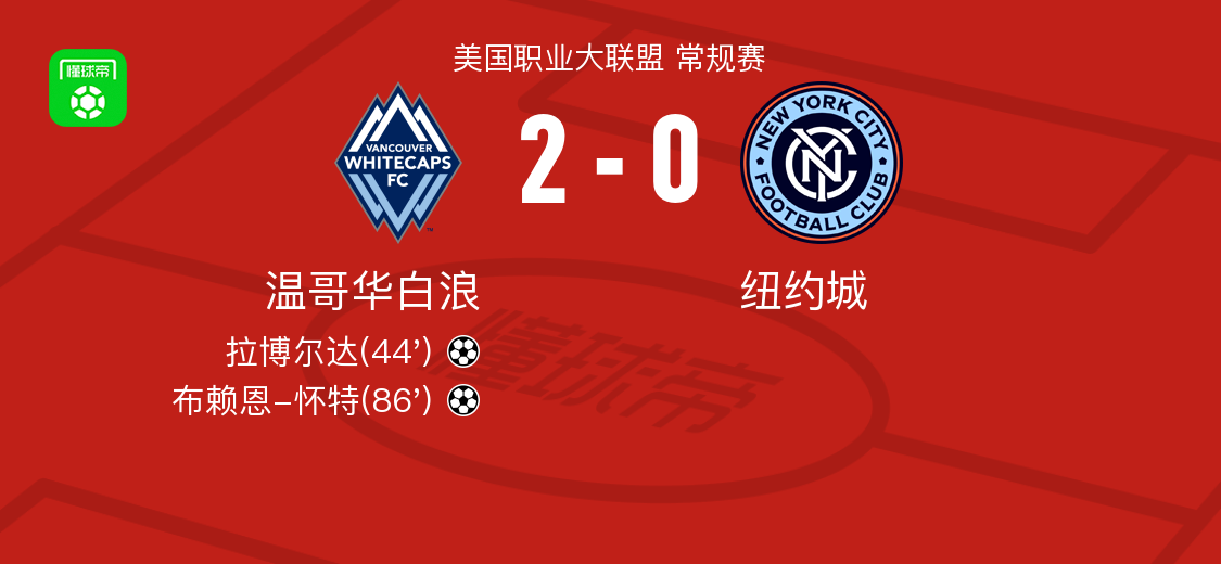 温哥华白浪2 - 0力克纽约城,拉博尔达、布赖恩 - 怀特闪耀全场