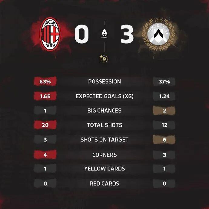 随着主裁判一声哨响,全场比赛结束,AC米兰0-3负于乌迪内斯。