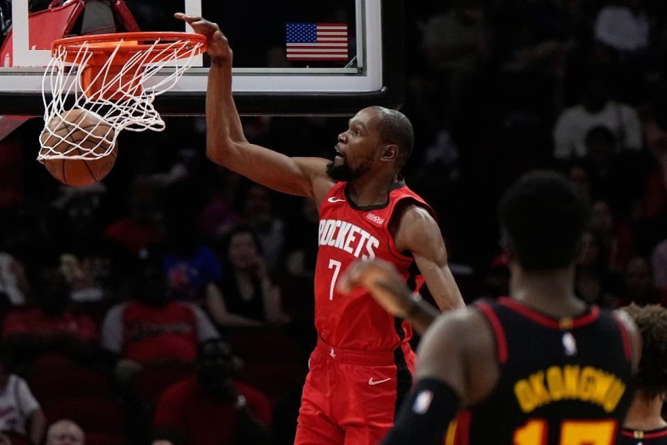 中场休息回来,火箭队的进攻火力进一步提升,本场第二次单节得分超过35分,同时限制老鹰队本场首次单节得分不足25分。老鹰队率先追到差9分,但火箭队一波8-0的攻势迅速扩大领先优势至17分。随后,火箭队继续攻防碾压,逐步将领先优势扩大至88-64。老鹰队无力阻挡火箭队的攻势,火箭队单节以39-22狂胜17分。三节结束时,火箭队已经以101-76领先老鹰队。前三节比赛,火箭队三分球25中13,命中率超过5成,杜兰特得到25分6助攻与申京得到11分6篮板9助攻,引领火箭队已经有6人得分上双。反观老鹰队,三分球27中8,沃克得到21分引领4人得分上双。