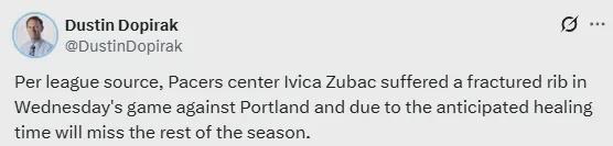 根据《印第安纳波利斯星报》资深记者Dustin Dopirak的最新消息,步行者中锋祖巴茨因肋骨骨折伤势严重,已确定提前告别本赛季剩余赛事。