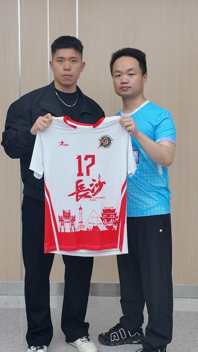 【球衣交接仪式】沈柏屹(左)与俱乐部总经理共同展示新赛季17号战袍,这个数字承载着特殊意义——2025年他正是穿着这个号码率领常州职工联赛队伍夺冠。