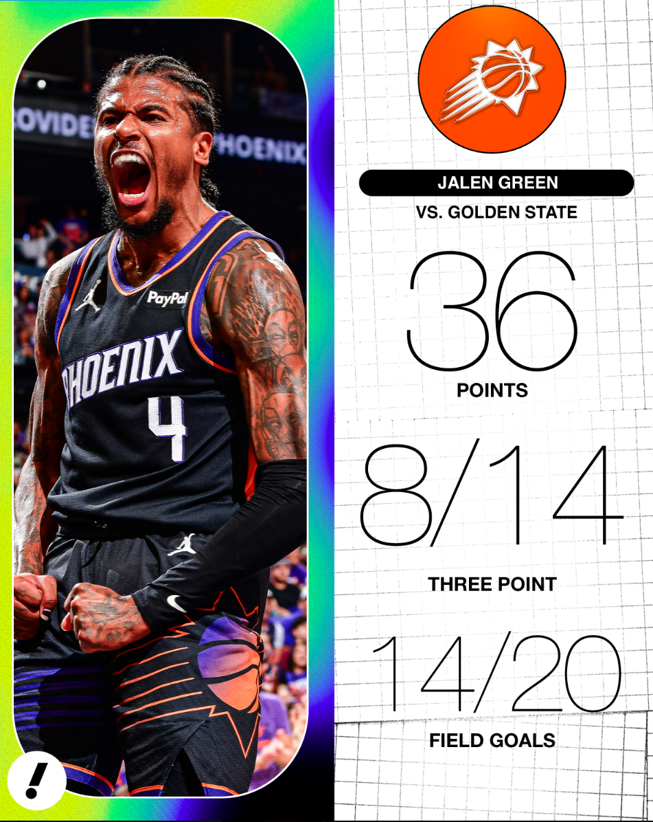 赛后,杰伦-格林在主场享受到了凤凰城球迷如潮水般的欢呼与呐喊。在附加赛G1中,他就已经展现出了强大的得分能力,拿到了35分并投进了2个三分球。而在附加赛的两场比赛中,格林合计砍下了71分,并命中了10个三分球,场均数据达到了35.5分、5.5个篮板、1.0次抢断和2.0次盖帽,命中率高达57%,三分球命中率也达到了47%,这样的表现无疑令人惊叹。