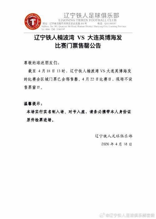 在22日的夜晚,足球的激情将在中超赛场上再次点燃。大连英博队将远赴客场,与辽宁铁人队展开中超第七轮的激烈对决。这场比赛意义非凡,因为它标志着时隔12年之后,辽宁地区再次迎来了中超层面的德比大战。如此盛事,自然吸引了双方球迷的极大关注。就在18日当天,辽宁铁人俱乐部传来喜讯,截至下午13时,本场比赛的球票已经全部售空,足见球迷们的热情之高。