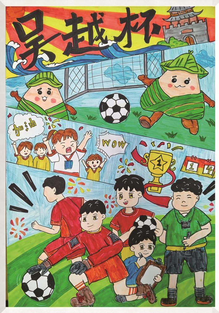 《粽香四溢,吴越激战正酣》 N海宁市海洲小学201班 林澜 指导老师:钱秋燕 专家点评:当前,2026年吴越杯浙江省城市足球联赛正进行得热火朝天,备受瞩目。在这幅充满创意的作品中,小作者巧妙地以粽子这一嘉兴特色美食作为创作起点,瞬间将人们的思绪引向了“吴越杯”揭幕战在嘉兴的盛大举行。作品中,小作者不仅细致入微地捕捉到了现场热烈而紧张的氛围,还通过生动传神的人物刻画,将胜利后的喜悦与欢呼展现得淋漓尽致,仿佛让读者身临其境。这幅作品无疑是一幅绘画语言丰富、情感表达真挚的佳作。