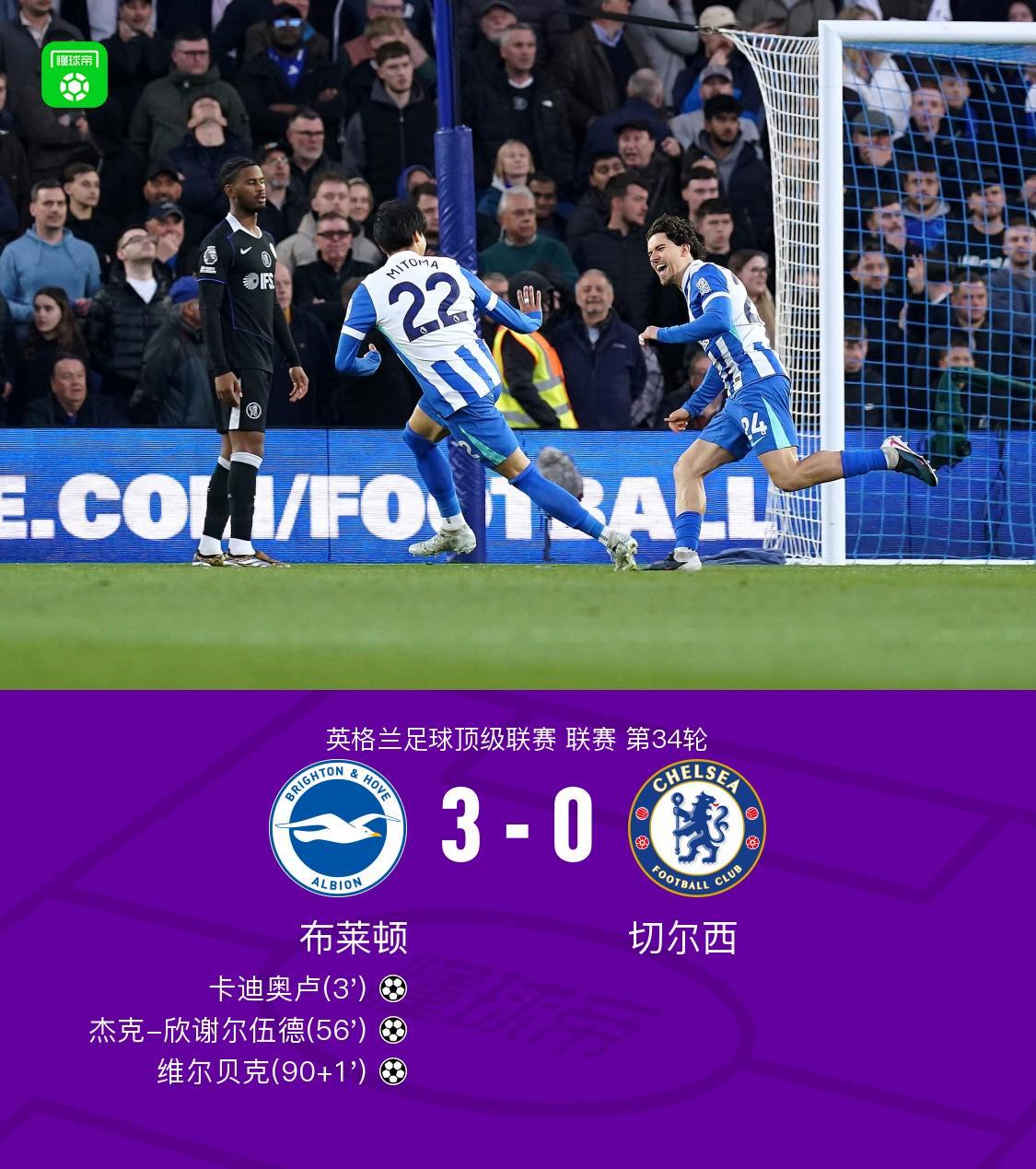 第90 + 1分钟,德克伊珀左路传中,维尔贝克门前推射破门,布莱顿3 - 0战胜切尔西