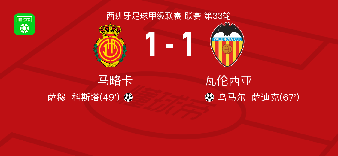 西甲第33轮:马略卡1-1战平瓦伦西亚,萨穆-科斯塔与乌马尔-萨迪克各建一功