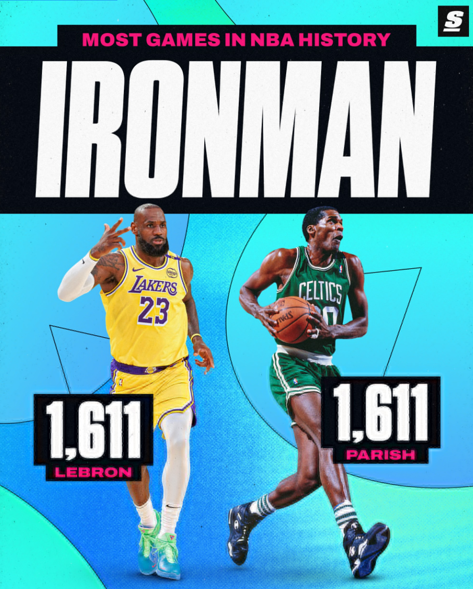 1. 詹姆斯生涯出场数达到1611场,追平帕特里什并列历史第一;