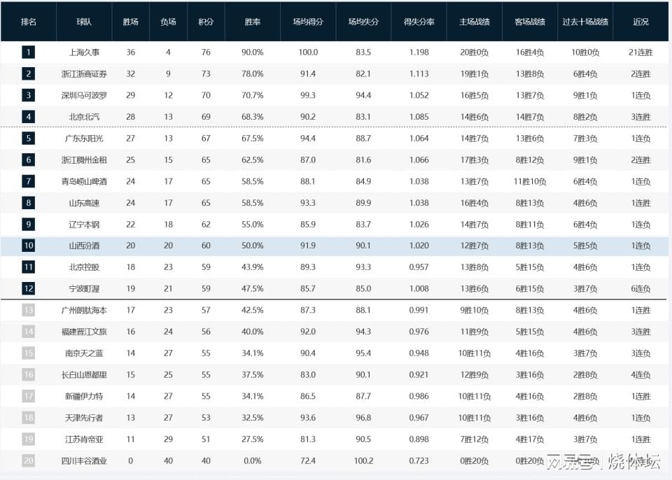 CBA最新积分榜:北京巩固前四优势 北控让出季后赛主动权