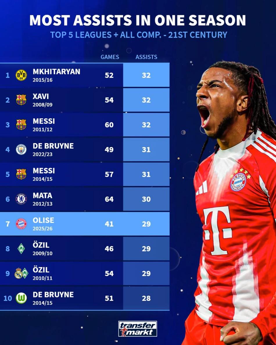 7. 奥利塞(拜仁慕尼黑)2025-26赛季:41场29次助攻