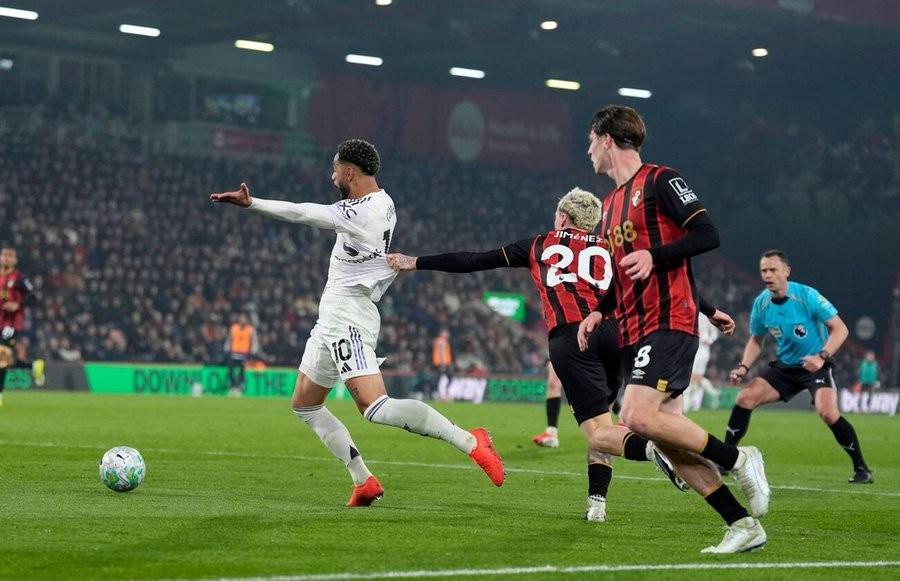 中场休息归来,库尼亚迅速进入状态,展现了他那令人叹为观止的第一脚触球技术。面对希门尼斯的严密防守,库尼亚轻松写意地完成了一次精妙绝伦的触球,随后迅速切入伯恩茅斯的禁区腹地。希门尼斯在追赶过程中,情急之下拉拽了库尼亚的球衣,导致后者应声倒地,为曼联赢得了一粒宝贵的点球机会。