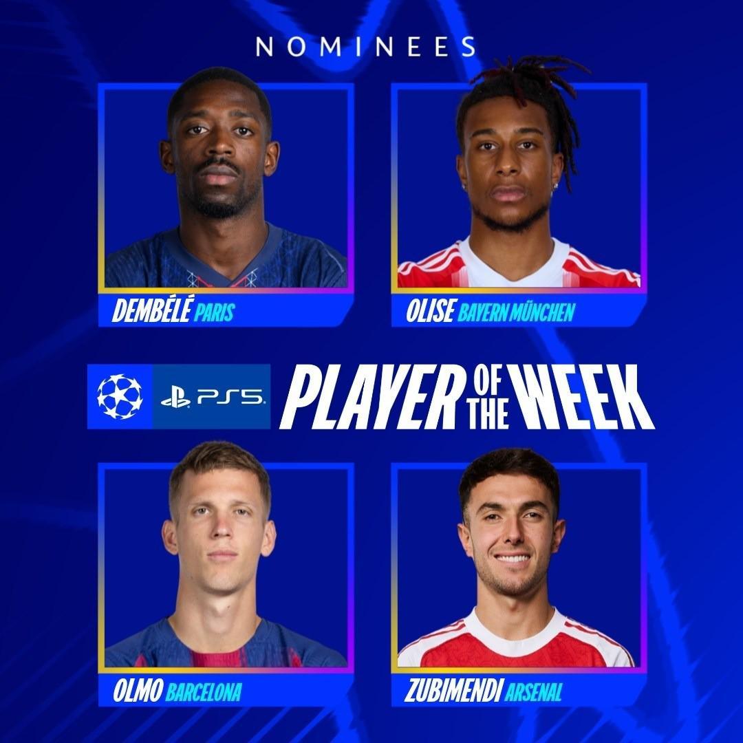 本周欧冠最佳球员候选:登贝莱、奥利塞、奥尔莫、马丁 - 苏比门迪