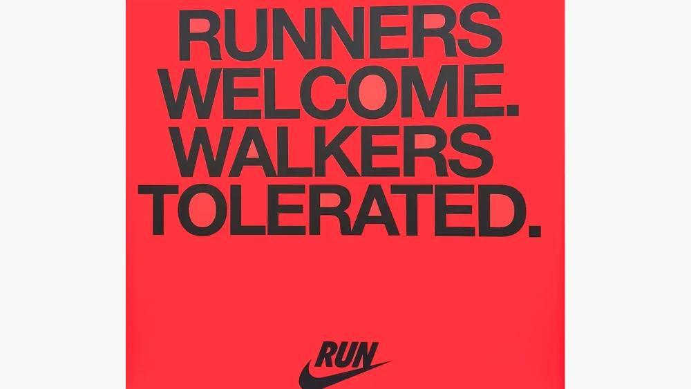 这则广告以醒目的鲜红色橱窗贴膜形式,展示在耐克位于波士顿的门店外。其上的标语“跑步者欢迎 步行者容忍”迅速在社交媒体上发酵,引发了大量跑者和网友的强烈不满与谴责。面对舆论的汹涌,耐克不得不将该广告移除,使得原本多窗展示的橱窗中留下了一片显眼的空白区域。