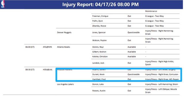 就在首轮对决即将拉开帷幕之际,NBA官方突然更新了伤病名单,引发了球迷们的广泛关注: