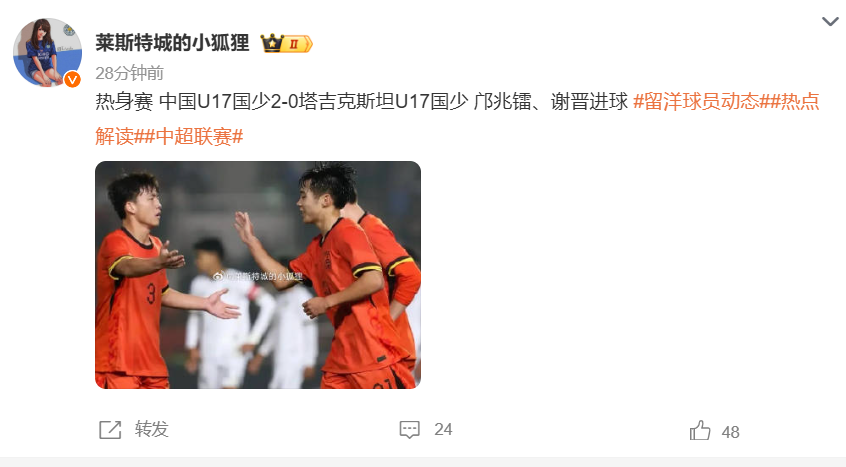 2-0完胜!中国U17国足再传捷报,邝兆镭谢晋联手建功,浮嶋敏热身赛豪取四连胜