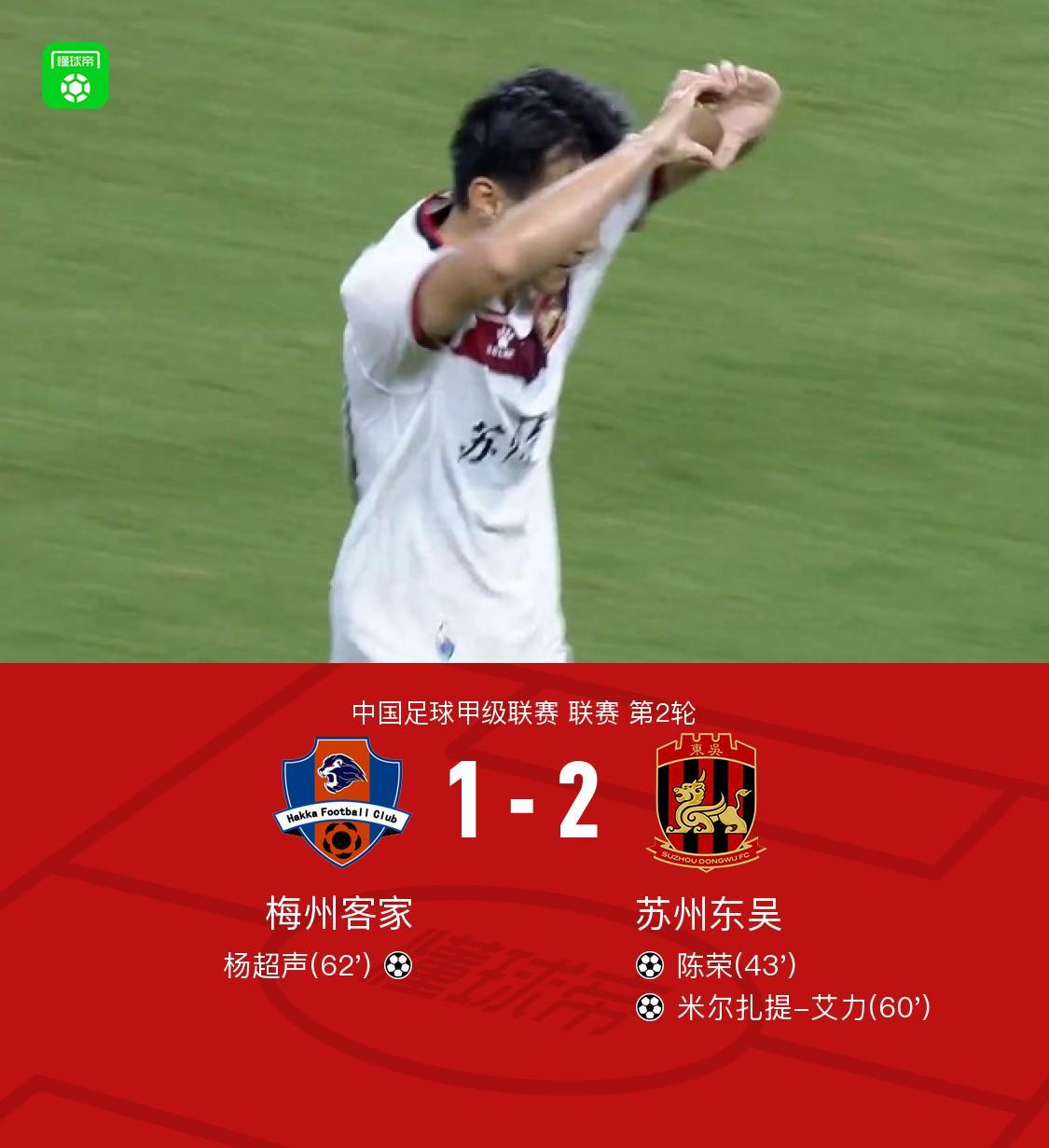 在3月21日进行的中国足球甲级联赛第2轮赛事中,梅州客家坐镇主场迎战苏州东吴。比赛中,梅州客家的杨超声成功破门,而苏州东吴则凭借陈荣和米尔扎提 - 艾力的出色发挥各进一球。最终,梅州客家以1-2的比分惜败于苏州东吴。