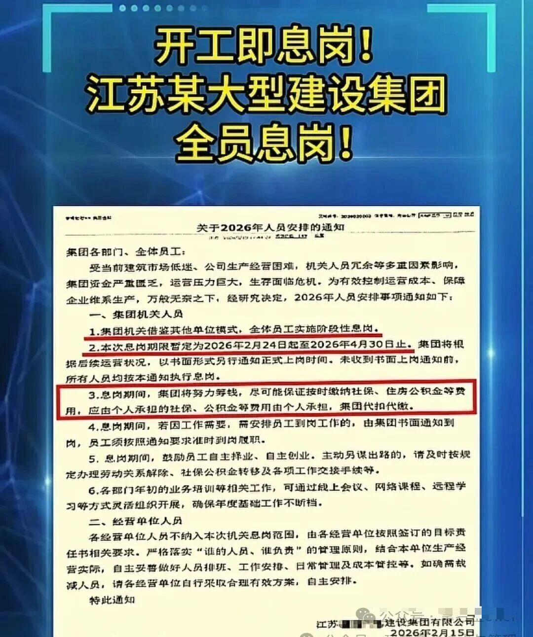 江苏某家历史悠久的特大型建筑企业,宣布自2月24日起,全体员工进入息岗状态。