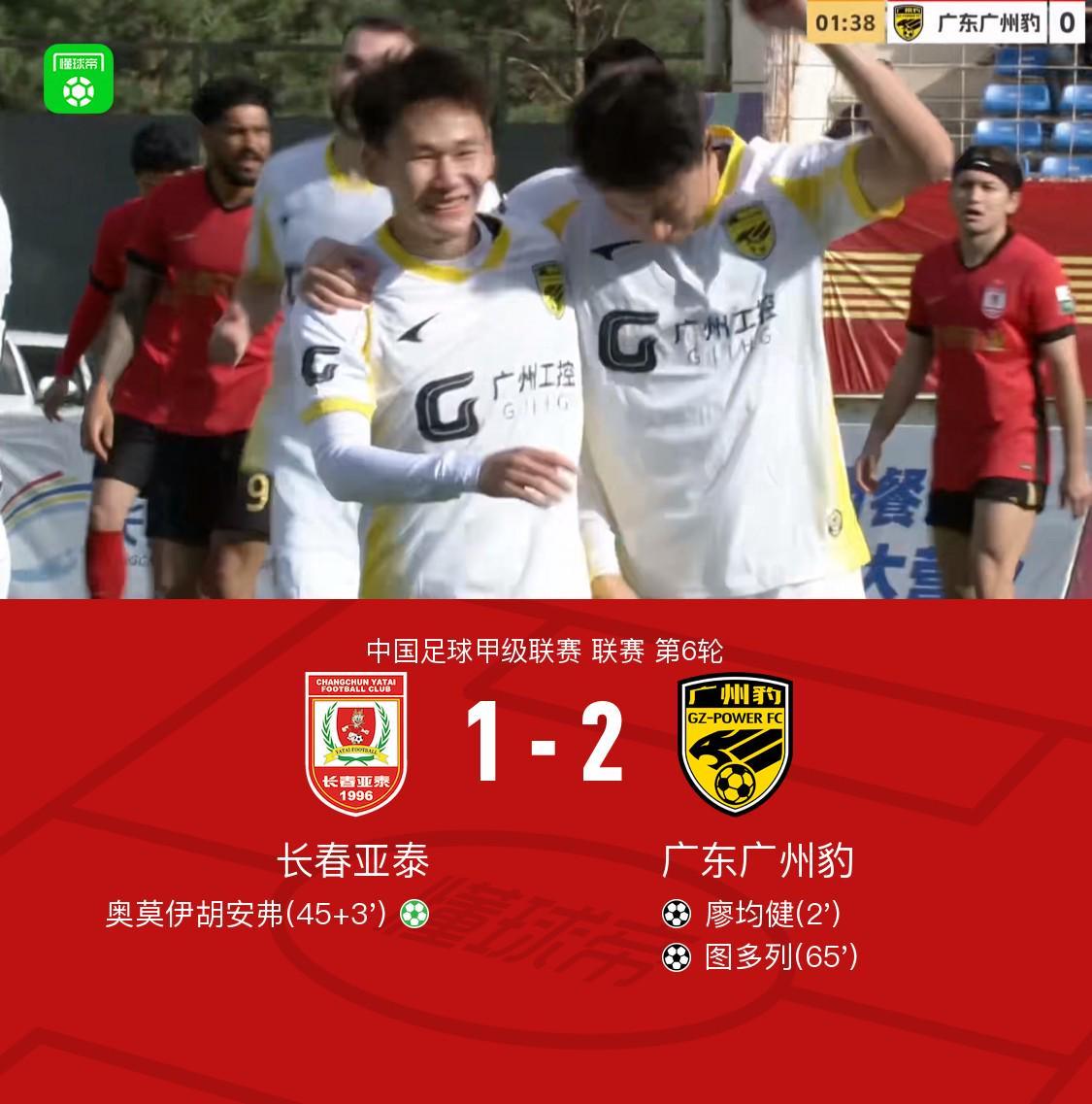 中甲战报:广州豹2-1力克亚泰豪取三连胜,廖均健开场闪击图多列制胜