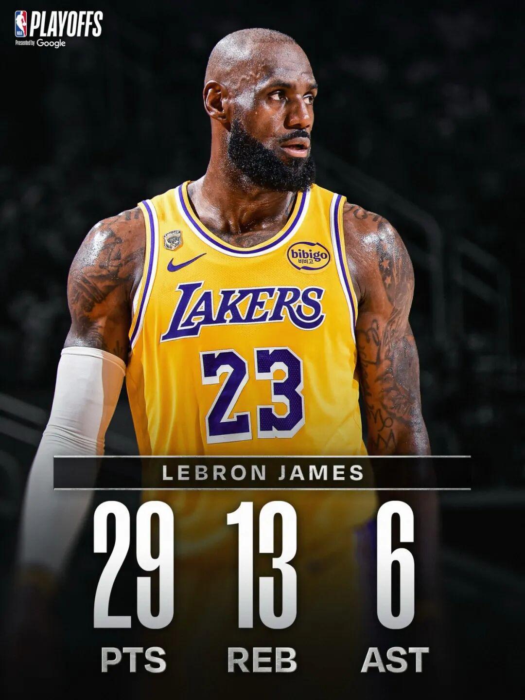 此役,41岁的詹姆斯再次展现了他的不老传奇,全场出战长达45分钟,投篮22次命中10球,三分球9投4中,罚球6中5,独得29分并摘下13个篮板,送出6次助攻,还有3次抢断和1次盖帽入账,表现堪称全面。