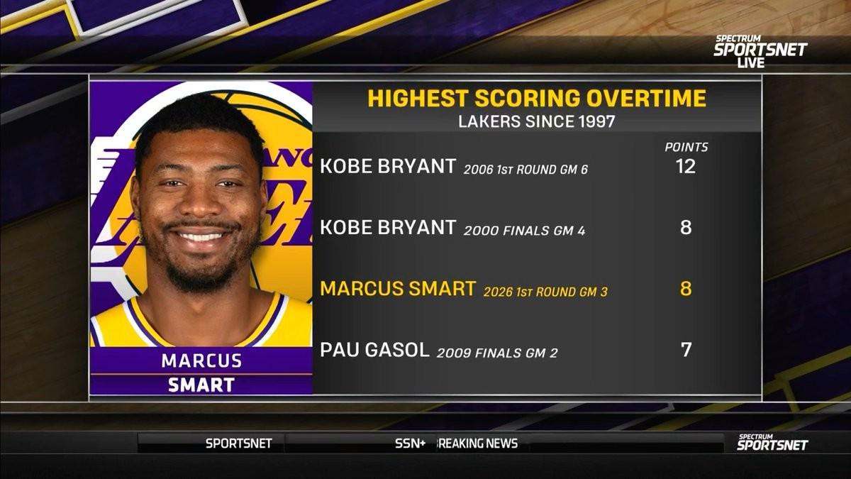 赛后,根据权威数据统计,斯马特在加时赛中的8分表现,使他成为了自1997年以来,湖人队在季后赛单场加时赛中得分第二高的球员。这一成就,仅次于2006年季后赛首轮第六场加时赛中,科比那震撼人心的12分表现。