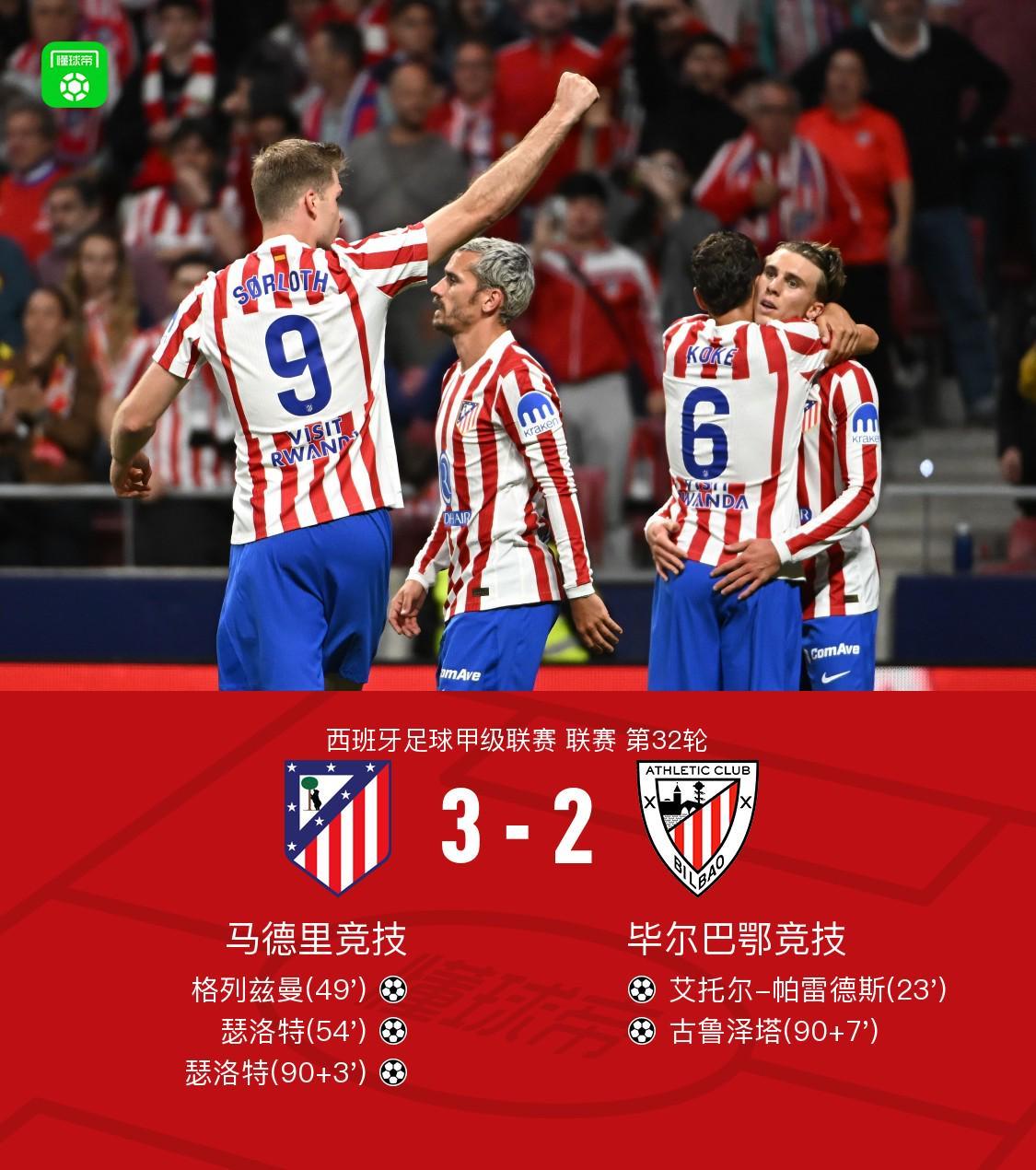 北京时间4月26日晚,西班牙足球甲级联赛第32轮迎来一场焦点对决,马德里竞技坐镇主场迎战毕尔巴鄂竞技。本场比赛,马竞方面格列兹曼攻入关键一球,瑟洛特更是上演梅开二度的好戏;毕尔巴鄂竞技则由艾托尔-帕雷德斯和古鲁泽塔分别建功。最终,经过90分钟的激战,马竞以3-2的比分力克毕尔巴鄂竞技,收获宝贵三分。