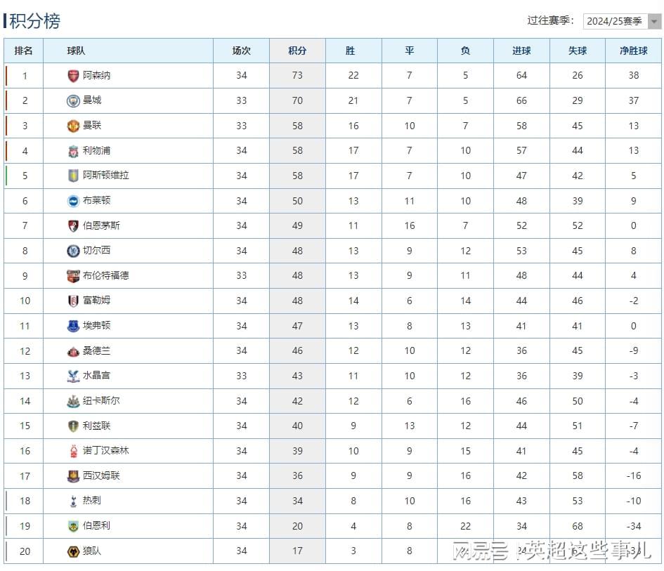 在其他几场比赛中,热刺客场1-0力克狼队,虽然终结了不胜纪录,但排名依旧岌岌可危;西汉姆联则在主场2-1绝杀埃弗顿,领先热刺2分;而维拉则客场0-1不敌富勒姆,遗憾跌出联赛前4的行列。