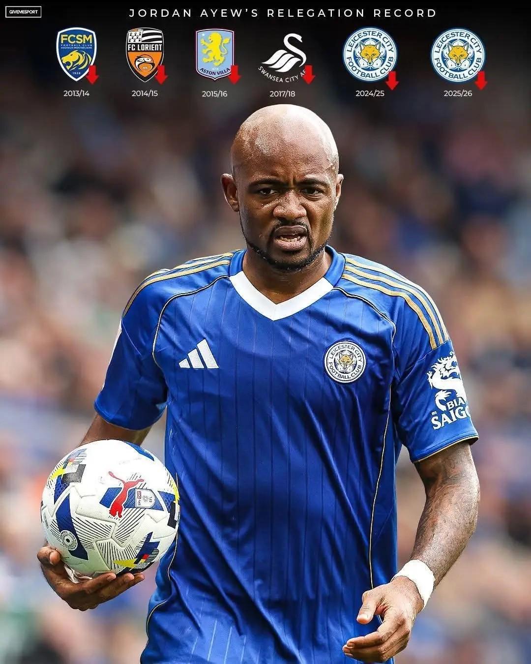 莱斯特城降级,乔丹-阿尤成足坛“降级专业户”,六次随队跌落