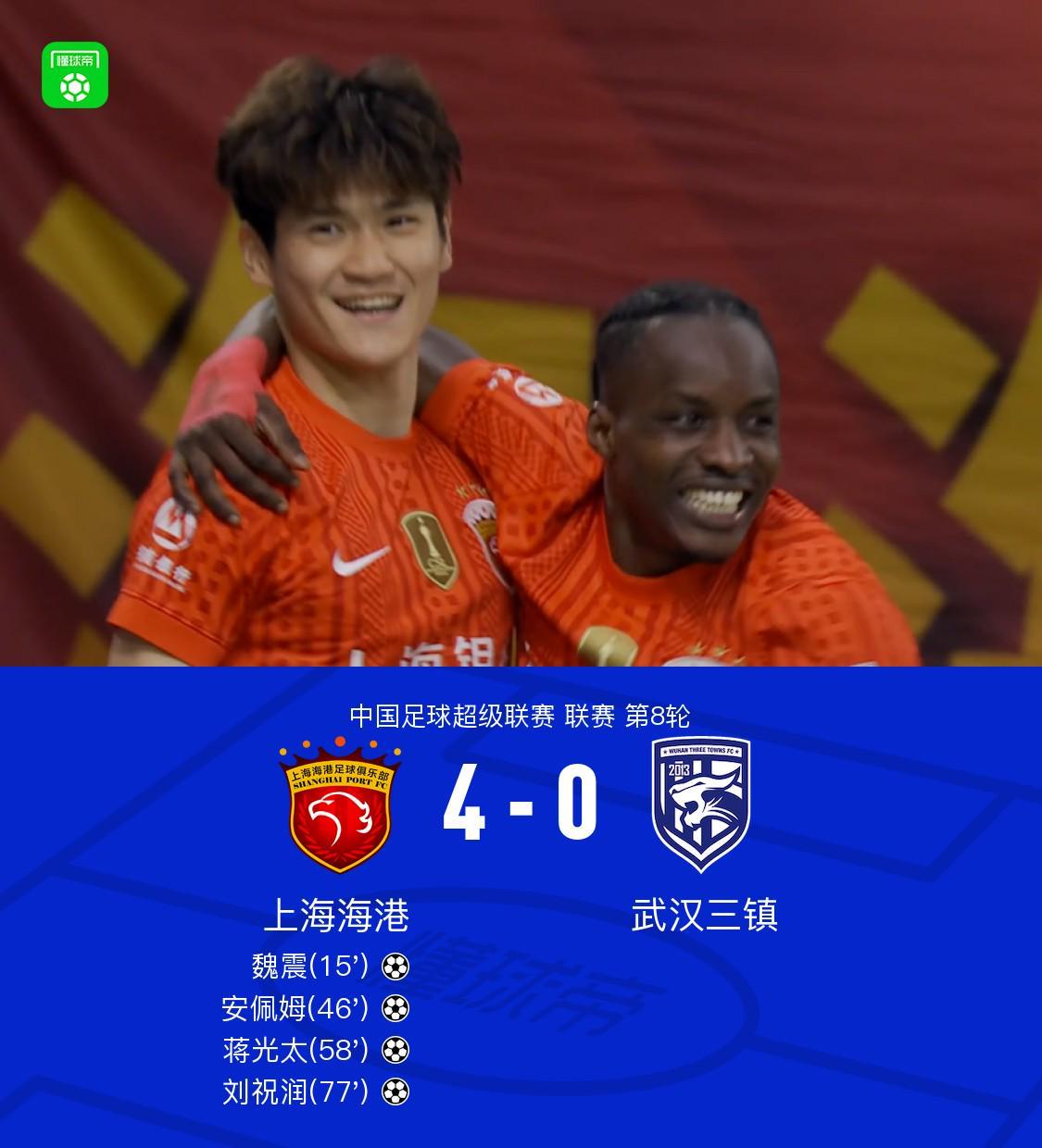 在4月25日进行的中国足球超级联赛第8轮赛事中,上海海港坐镇主场迎战武汉三镇。此役,刘祝润贡献一传一射的精彩表现,蒋光太与魏震分别建功,安佩姆也有进球入账,而维塔尔则送出两次助攻。最终,上海海港以4-0的比分大胜武汉三镇。