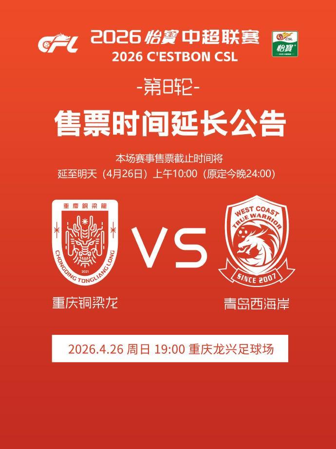 北京时间4月25日,重庆铜梁龙足球俱乐部通过官方渠道正式发布了一则重要公告,宣布本轮主场赛事的售票截止时间将进行延长调整,具体延至次日(即4月26日)上午10:00。