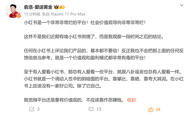 追觅俞浩炮轰小红书:价值观与盈利模式皆有毒,无一家好公司