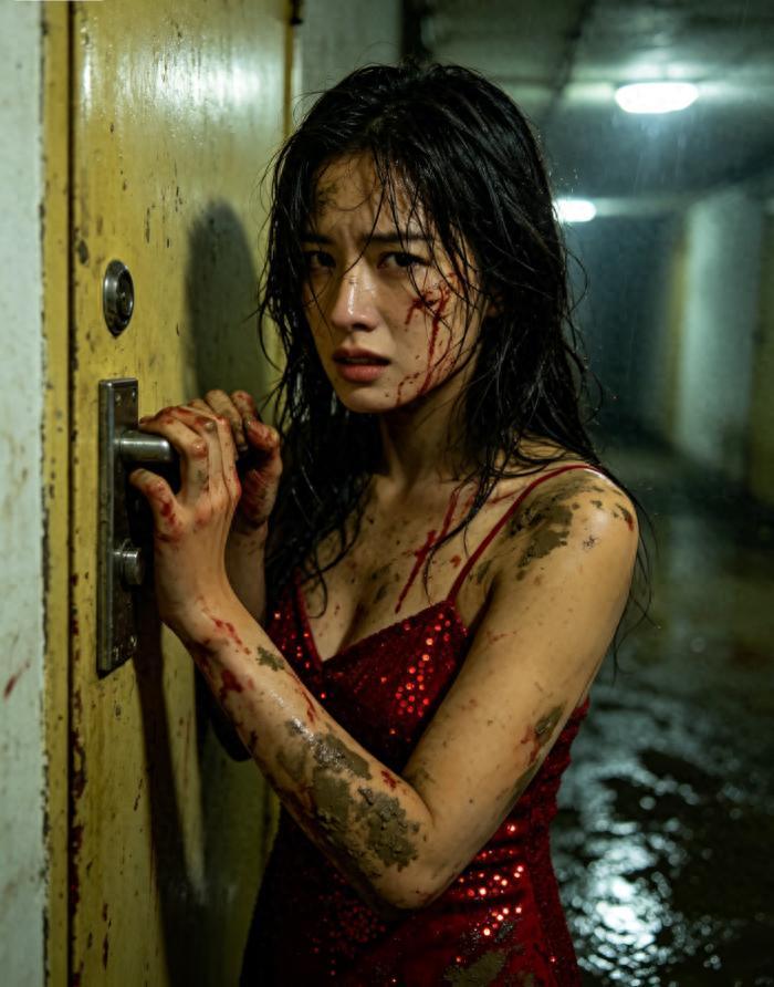 她身上那件本该闪耀的红色亮片连衣裙,此刻半边沾满泥浆与暗红色液体,在昏暗的灯光下泛着诡异的光泽。