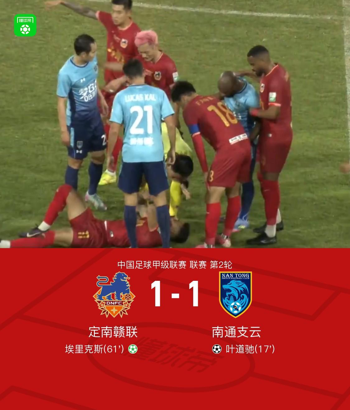 定南赣联1-1南通支云,叶道驰首开纪录,埃里克斯点球救主