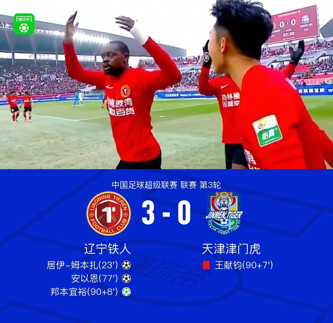 辽宁铁人3-0力克津门虎迎中超首胜,姆本扎、安以恩、邦本宜裕建功,王献钧红牌离场