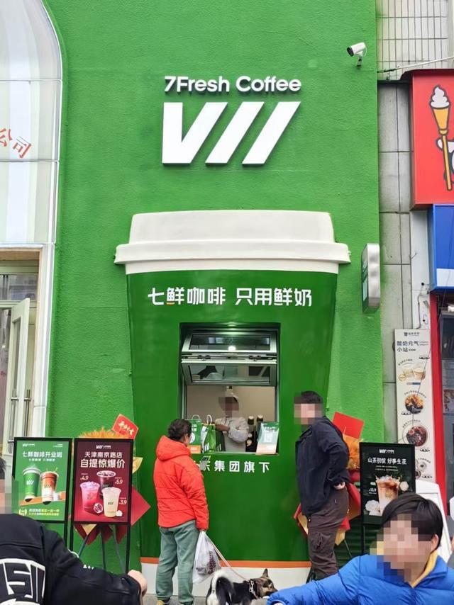 据徽声在线记者实地探访,该店坐落于天津鞍山道与南京路交汇处的核心商圈,10平米的迷你档口采用全开放式设计,以蒂芙尼蓝为主色调的立体咖啡杯造型窗口格外吸睛。门头醒目标注"七鲜咖啡,只用鲜奶"的品牌主张,配合罗马数字VII与英文标识形成视觉记忆点,在传统咖啡店林立的商圈中脱颖而出。