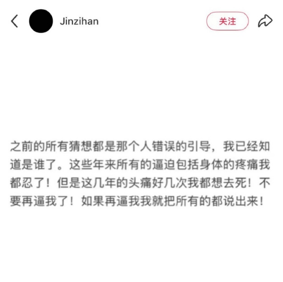 金子涵在文中写道:“过去所有的猜测,都是源于那个人的错误引导,现在我已经明确知道是谁了。这些年里,我忍受了无数的逼迫,甚至身体上的疼痛,我都默默承受了下来。但最近几年,头痛问题愈发严重,好几次我都产生了轻生的念头!请不要再逼我了!如果继续这样,我将不再保持沉默,把所有事情都公之于众!”