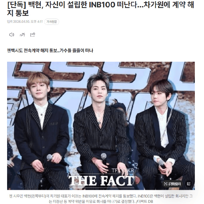 徽声在线消息,根据权威媒体披露,4月10日当天,知名歌手边伯贤、金珉锡以及金钟大三位艺人,在3月底便已向INB100公司的代表车佳元正式发送了内容证明文件。该文件明确要求对方针对包括未结算收益在内的多项违约事项给出明确答复,并同时表达了解约的意向。然而,尽管已经过了两周的答复期限,由这三位艺人组成的CBX组合仍未收到任何合理且令人满意的回应。