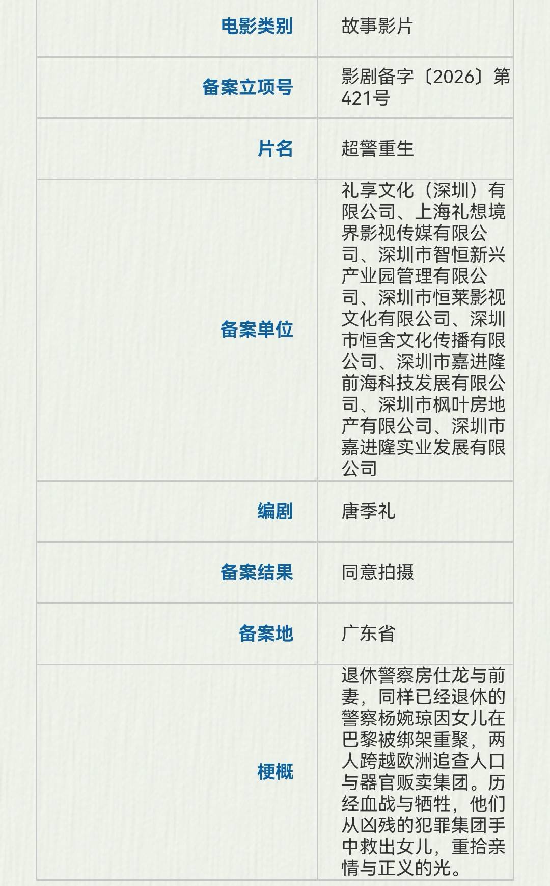 《超警重生》这部影片由礼享文化(深圳)有限公司携手上海礼想境界影视传媒有限公司等多家实力雄厚的公司共同备案。该片由唐季礼亲自操刀编剧,剧情扣人心弦:讲述了一位已经退休的警察房仕龙,与同样退休的前妻——警察杨婉琼,因女儿在浪漫之都巴黎不幸遭遇绑架而再度携手。他们毅然决然地跨越欧洲大陆,展开了一场惊心动魄的追查行动,目标直指那罪恶滔天的人口与器官贩卖集团。在这场充满血与火的较量中,他们经历了无数艰难险阻,甚至不惜付出生命的代价。最终,他们凭借着坚定的信念和过人的勇气,成功从凶残的犯罪集团手中解救出了女儿,同时也重拾了那份久违的亲情与正义的光芒。