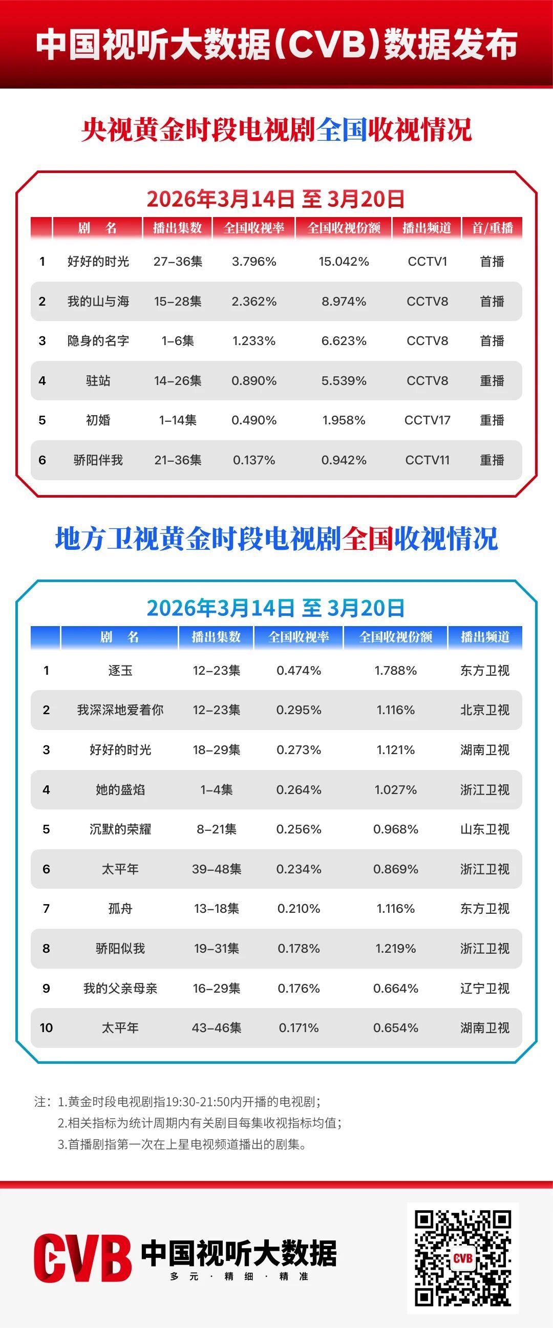 徽声在线最新消息!CVB收视周报正式揭晓【2026年3月14日至3月20日】黄金时段电视剧收视排名情况✨