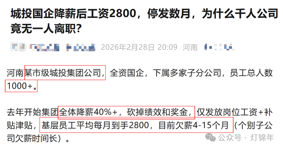 去年,有陕西的网友留言称,他们所在的国企城投也已连续九个月未发放工资,但同样无人选择离职;