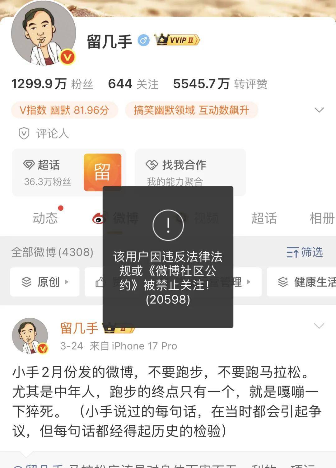 惊爆!据徽声在线最新消息,知名网络大V留几手的微博账号突然被禁止关注,这一突发状况瞬间在网络上掀起了轩然大波……