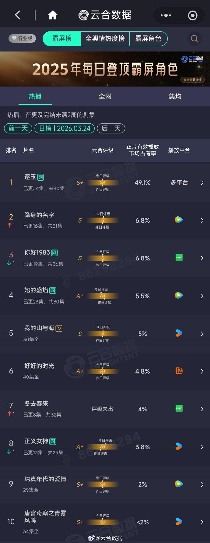 据云合数据2026年3月24日长剧热播榜显示,《逐玉》稳居榜首。